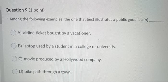Among the following examples, the one that best illustrates a public good is:. 5 Among the following examples the one that best illustrates a public good is an A laptop used by a student in a college or university. All benefits associated with the production and use of a public good are received by the government. A public utility is a classic example of.