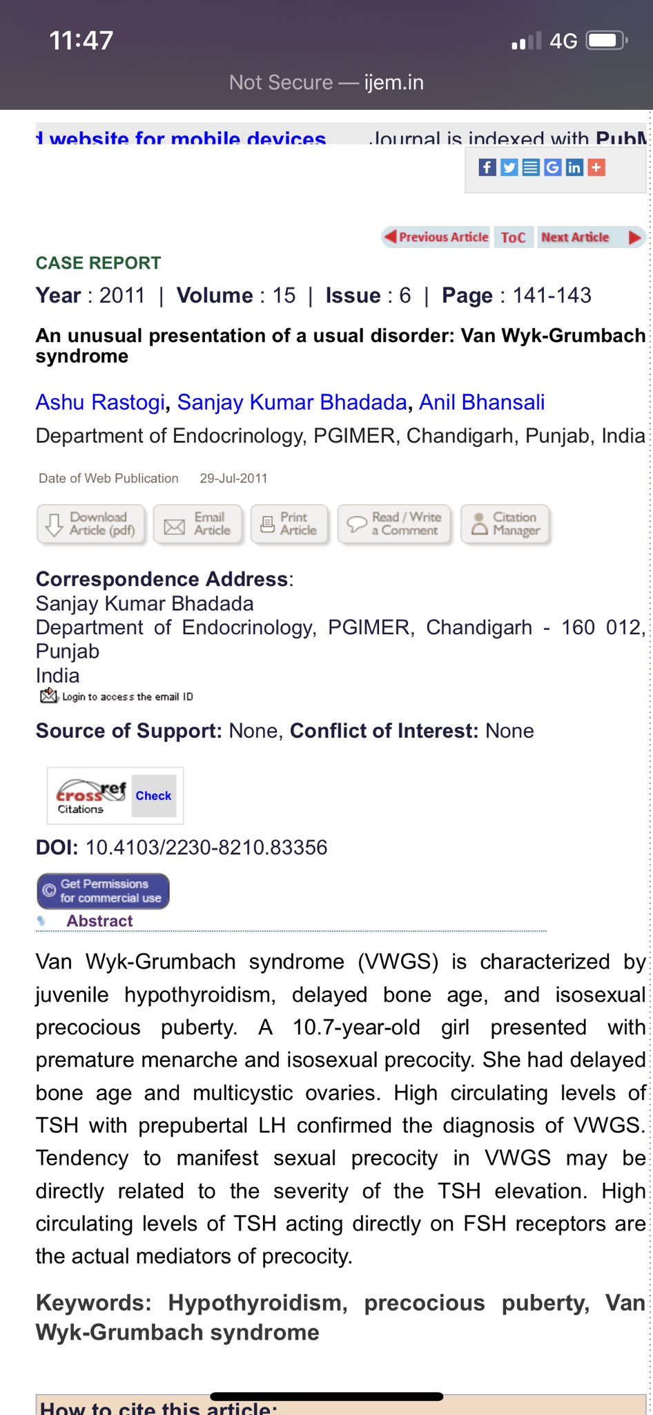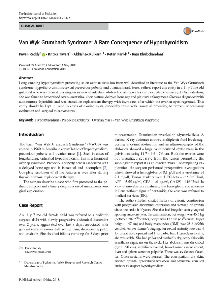 Van Wyk-Grumbach syndrome is a rare disease characterized by prolonged hypothyroidism precocious puberty with multicystic enlarged ovaries and features of polycystic ovarian disease PCOD. Van Wyk Grumbach syndrome is well known for protracted hypothyroidism characterised by multicystic ovaries normal size ovaries contain many follicles of various sizes isosexual precocious puberty and delayed skeletal growth. Here authors report this entity in a 11 y 7 mo old girl child who was referred to a surgeon in view of intestinal obstruction along with a multiloculated ovarian cyst. A 107-year-old girl presented with premature menarche and isosexual precocity. The VWGS was diagnosed and thyroid hormone replace-. It is a rare clinical entity that presents with prolonged untreated hypothyroidism. Hachicha M 1 Maaloul I 2 Aissa K 1 Kamoun T 1 Aloulou H 1. Little is known about the effect of. Van Wyk-Grumbach syndrome was first described in 1960 as a syndrome of juvenile hypothyroidism associated with pubertal advancement.