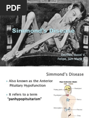 Simmonds disease is a chronic deficiency of function of the pituitary gland a form of hypopituitarism that leads to atrophy of many of the viscera including the heart liver spleen kidneys thyroid adrenals and gonads. Video presentation for BIO 33 online at Los Angeles Valley College. SIMMONDS DISEASE By V. Simmonds disease and Sheehans syndrome are conditions that occur when the pituitary is asleep at the wheel failing to make hormones vital to keeping our bodys systems in. Simmonds disease is a chronic deficiency of function of the pituitary gland a form of hypopituitarism that leads to atrophy of many of the viscera including the heart liver spleen kidneys thyroid adrenals and gonads. From Wikipedia the free encyclopedia Redirected from Simmonds disease Sheehans syndrome also known as postpartum pituitary gland necrosis is hypopituitarism decreased functioning of the pituitary gland caused by ischemic necrosis due to blood loss and hypovolemic shock during and after childbirth. Simondz panhypopituitarism in which cachexia is a prominent feature.