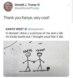 Although imagining Kim Kardashian as our first lady is a bit hard Kanye might just be the president we need right now. Refers to a tweet submitted by 45th President of the United States Donald Trump in response to a tweet posted by Kanye West in late April 2018.